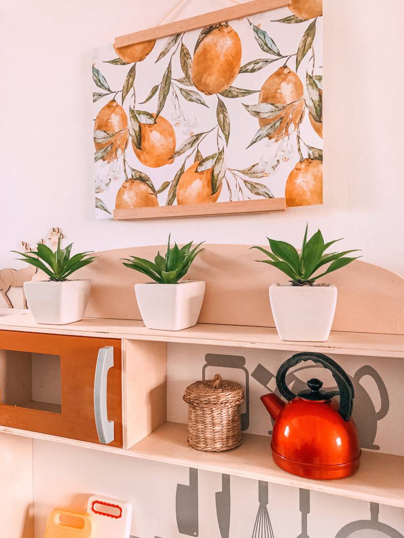 אני קישטתי את המטבח בעציצים קטנים, תמונה שמאוד אהבתי והוספתי ארגזי עץ לאחסון וסדר.